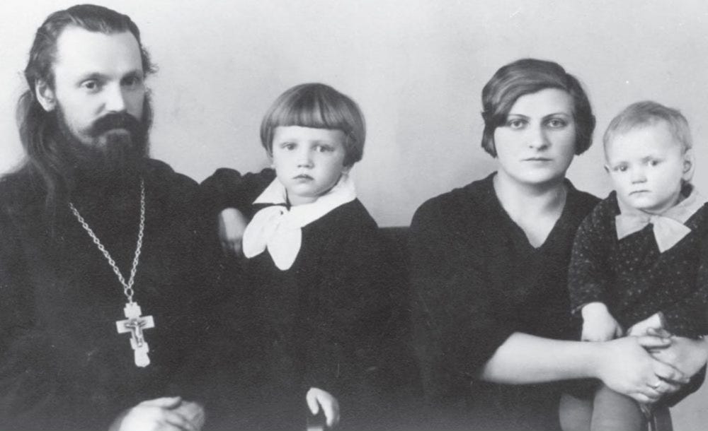 Fr. John Legkii (later ROCOR Bishop John) and, Matushka Ekaterina with their daughters Iraida, left and Galina, right. Latvia. Photo: I. Legkii, Letaiushchii arkhierei [A Flying Bishop] (Moscow 2014)