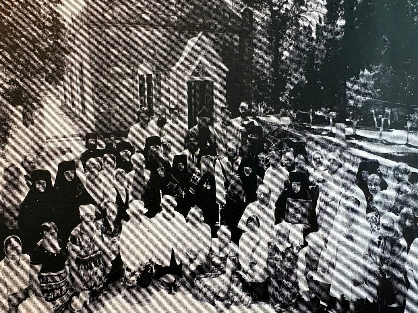 Mount of Olives, Jerusalem — The church of the ROCOR Convent of the Ascension marks the site where the head of St. John the Baptist was found. In this photograph (summer 1998) pilgrims from ROCOR’s American dioceses are seen with Archbishop Laurus, the fifth First Hierarch of the Russian Church Abroad (2001–2008). On his left stands Reader Nicholas Olhovsky, today the First Hierarch of ROCOR.