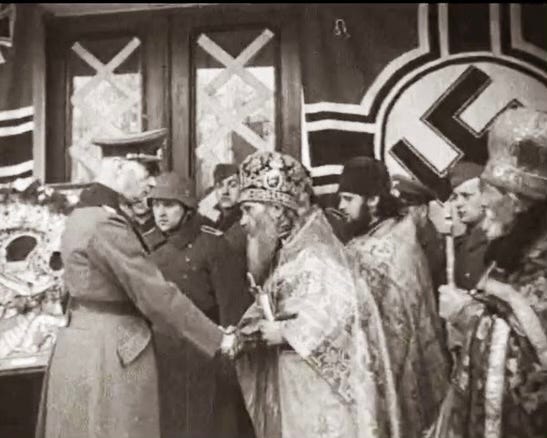The moment when the Tikhvin Icon of the Mother of God was transferred to the clergy in Pskov by the Wehrmacht, who took the icon from the Tikhvin Assumption Monastery in the Leningrad region of Russia. Such actions had propagandist value to convince audience that unlike the “Godless Reds,” National Socialists supported religion in the occupied regions